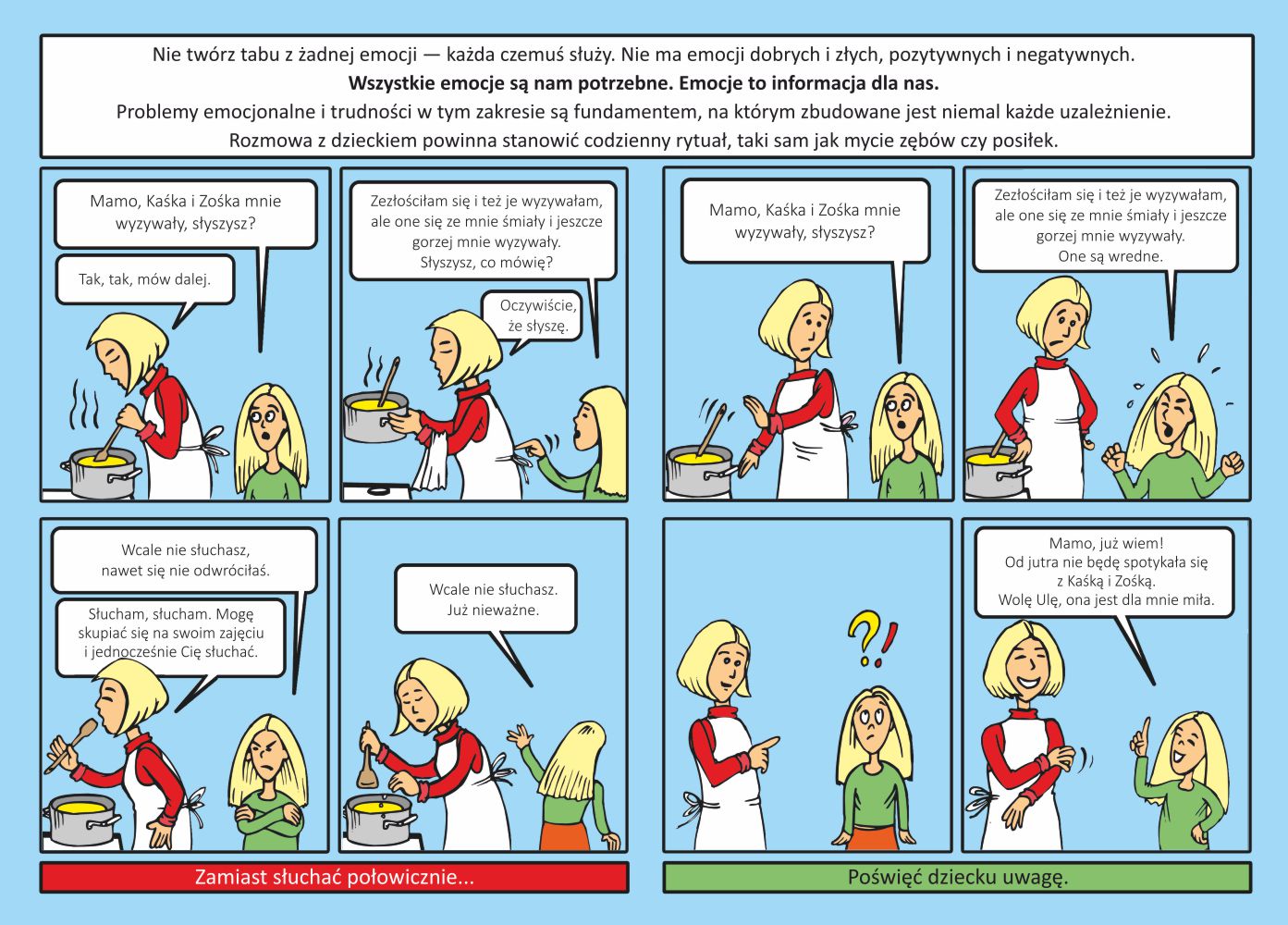 Apelujemy: tak samo jak pomagasz dziecku w pracy domowej z matematyki, polskiego, fizyki, pomóż mu uporać się z jego emocjami, wspólnie poszukajcie ich źródeł, nie „zamiatajcie problemu pod dywan” – to na pewno zaprocentuje. Zbuduj swój dom na mocnych fundamentach.